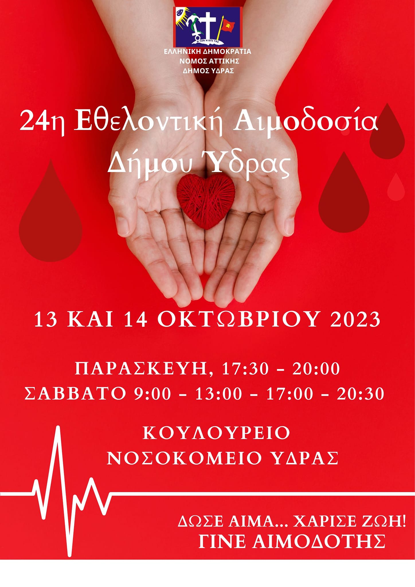 Ο Δήμος Ύδρας στο πλαίσιο της κοινωνικής ευαισθησίας και προσφοράς προς το συνάνθρωπο, διοργανώνει την 24η εθελοντική αιμοδοσία που θα πραγματοποιηθεί στο Κουλούρειο Νοσοκομείο Ύδρας.