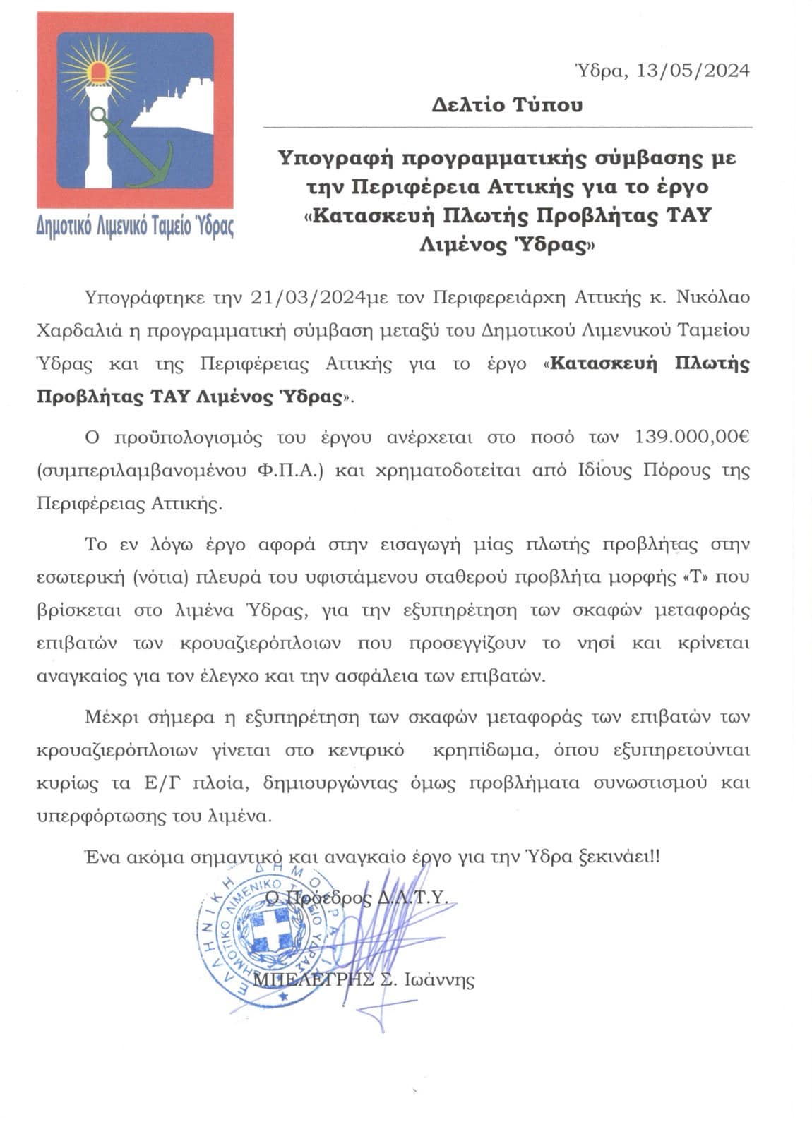 Υπογράφτηκε προγραμματική σύμβαση του Δημοτικού Λιμενικού Ταμείου Ύδρας με την Περιφέρεια Αττικής για το έργο της κατασκευής πλωτής προβλήτας στο ΤΑΥ του λιμανιού, προϋπολογισμού 139.000 ευρώ με ΦΠΑ, με χρηματοδότηση από ίδιους πόρους της Περιφέρειας Αττικής.