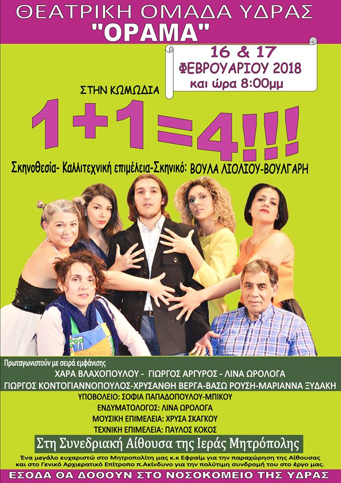 Η Θεατρική ομάδα Ύδρας "ΟΡΑΜΑ" παρουσιάζει την σπαρταριστή κωμωδία "1+1=4!!!!" στις 16 & 17 Φεβρουαρίου 2018 και ώρα 8:00μμ. σε σκηνοθεσία και καλλιτεχνική επιμέλεια της Βούλας Λιόλιου-Βούλγαρη.