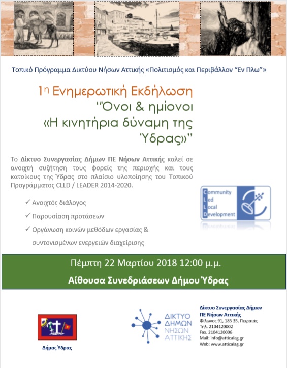 Το Δίκτυο Συνεργασίας Δήμων ΠΕ Νήσων Αττικής, στο πλαίσιο υλοποίησης του Τοπικού Προγράμματος «Πολιτισμός και Περιβάλλον “Εν Πλω” του Προγράμματος Αγροτικής Ανάπτυξης CLLD/ LEADER 2014-2020, πραγματοποιεί την 1η ενημερωτική εκδήλωση με θέματα: