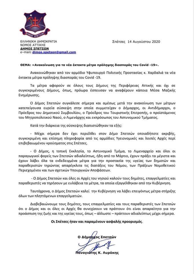 Επίσης ο Δήμος Σπετσών καλεί την κυβέρνηση να λάβει επιεγόντως μέτρα στήριξης όλων των πληττόμενων επιχειρήσεων.
