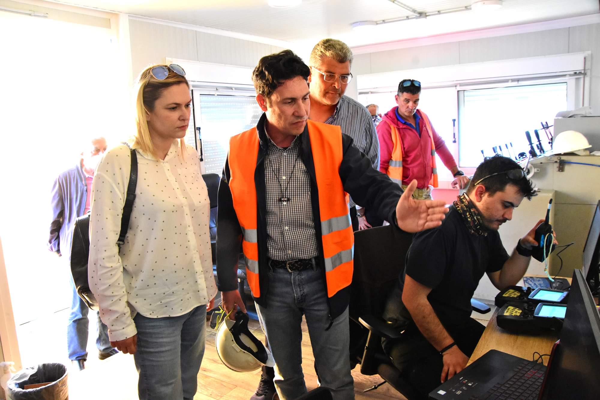 Αρχικά, η Αντιπεριφερειάρχης παρακολούθησε τη διαδικασία πόντισης τσιμεντοστρωμάτων για την προστασία του αγωγού ύδρευσης και ενημερώθηκε για τις λεπτομέρειες της διαδικασίας από τον υπεύθυνο μηχανικό του αναδόχου.
