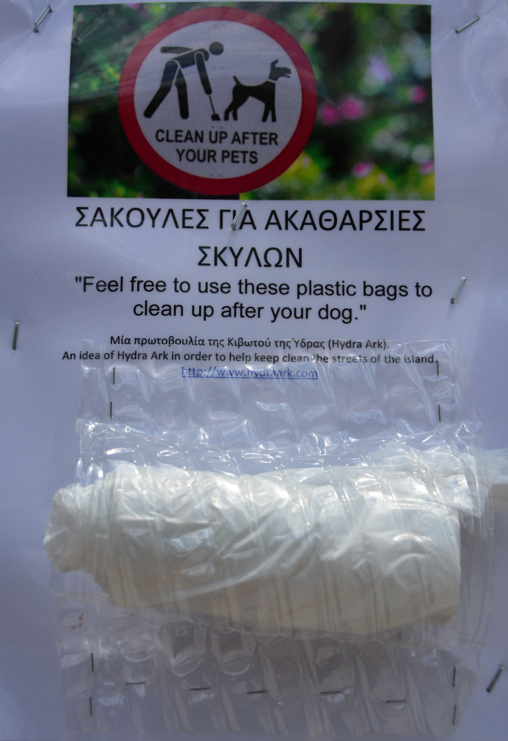 Πρόκειται για μια πρωτοβουλία του σωματείου «η Κιβωτός της Ύδρας», Hydra Ark, όπου μ’ αυτό τον τρόπο μπορούν οι πολίτες να αφαιρέσουν μία σακούλα και να τη χρησιμοποιήσουν για να μαζέψουν τις ακαθαρσίες των σκύλων τους. Οπωσδήποτε η συνεισφορά των πολιτών και η ευαισθησία τους σε θέματα καθαριότητας αποτελεί το «κλειδί» για μια Ύδρα καθαρή.
