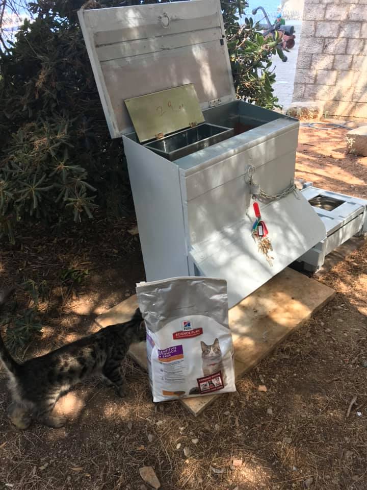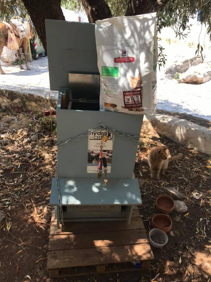 Στις κατά τόπους ξύλινες ταΐστρες (σπιτάκια) που έχει φτιάξει το Φιλοζωικό σωματείο "Υδραϊκή Κιβωτός", πηγαίνουν με μεγάλη συχνότητα οι εθελοντές του, όπου τις προμηθεύουν με ξηρά τροφή για τις γατούλες του νησιού!