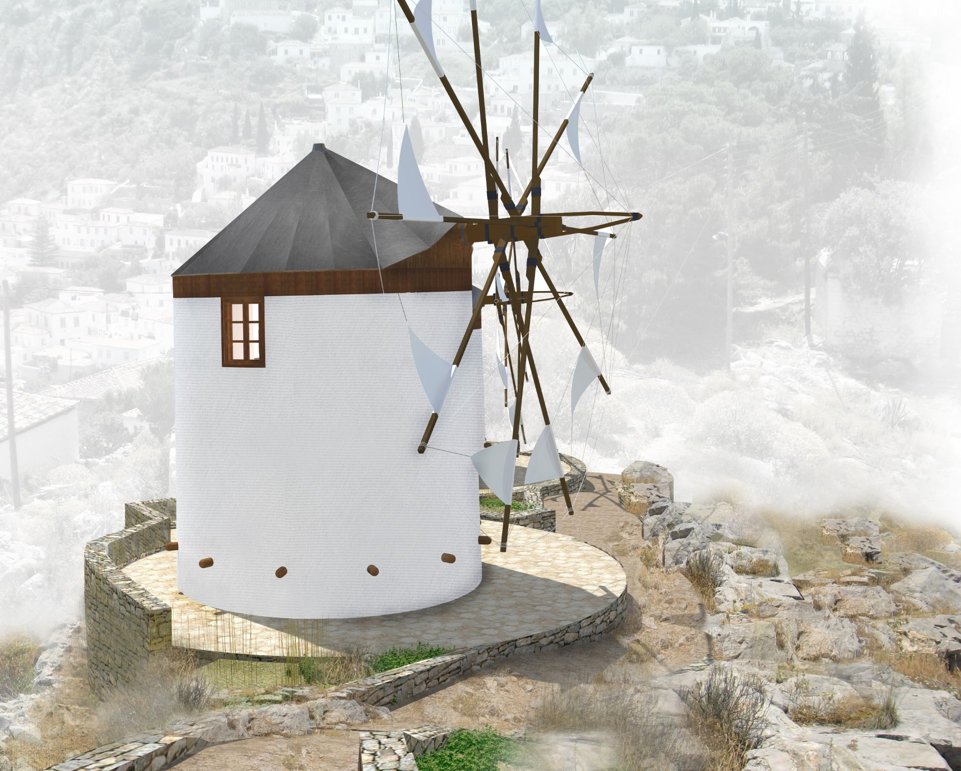 Η μετατροπή των ερειπωμένων ανεμόμυλων αφορά σε χώρο διαμονής και φιλοξενίας για τα δύο κτήρια.
