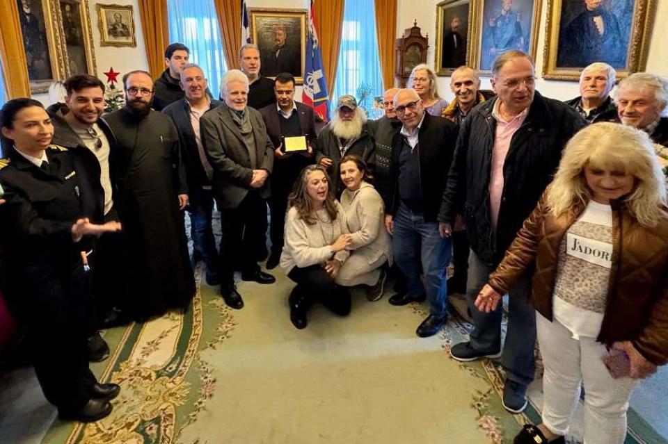 Τρίτον: Η Πρόεδρος του φορέα του Ιστορικού Αρχείου – Μουσείου Ύδρας του επέδωσε ένα αναμνηστικό κεραμεικό με τα ελληνικά χρώματα, τιμώντας και ευχαριστώντας τον με την κίνησή της αυτή, για τη διαχρονική προσφορά του στα ιστορικά και πολιτιστικά δρώμενα του Νησιού μας.