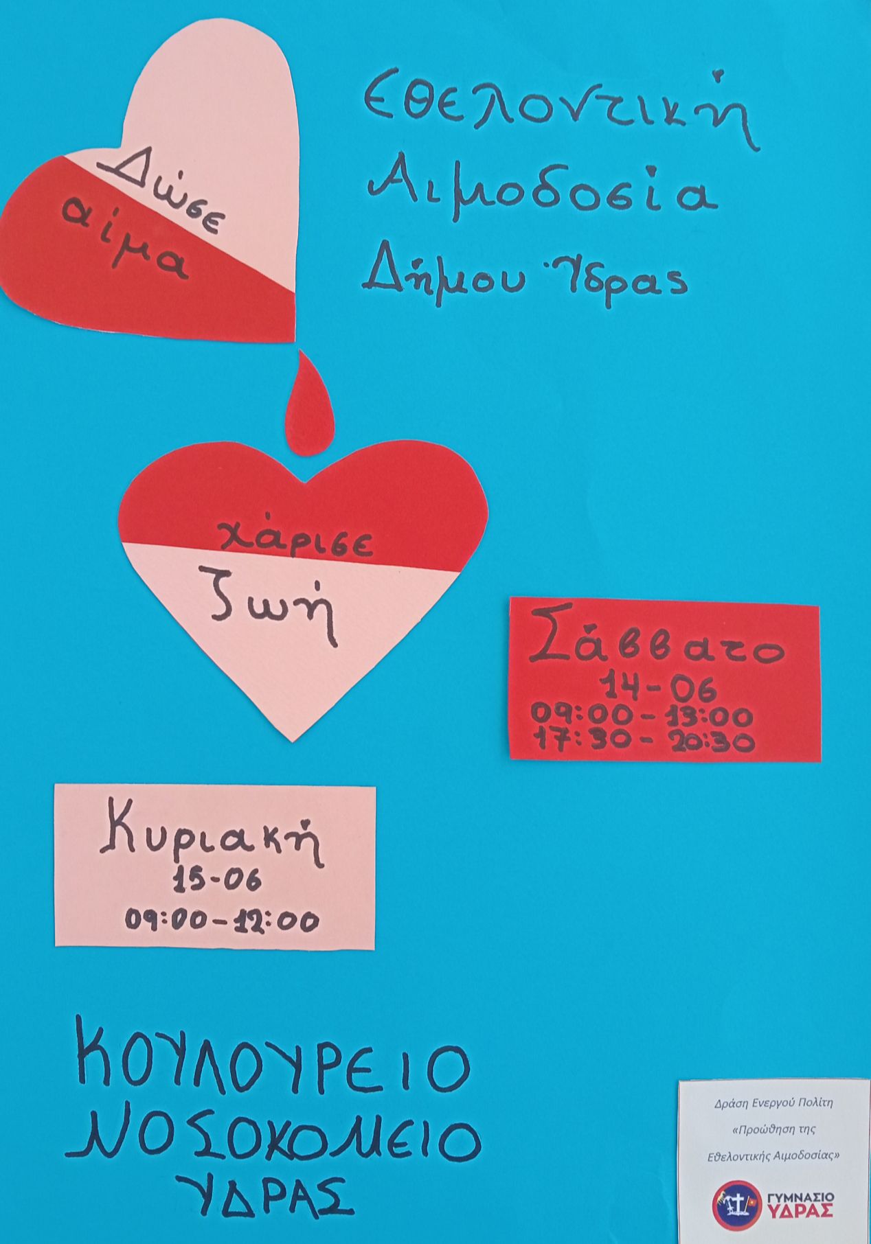 Την αφίσα, αντίτυπα της οποίας παρέδωσε το Γυμνάσιο στον Δήμο Ύδρας και ανάρτησε σε διάφορα σημεία του νησιού, δημιούργησαν οι μαθήτριες και οι μαθητές της Α ' τάξης του σχολείου στο πλαίσιο δράσης προώθησης της εθελοντικής αιμοδοσίας.