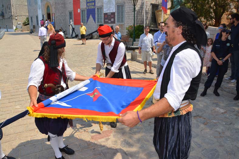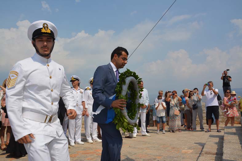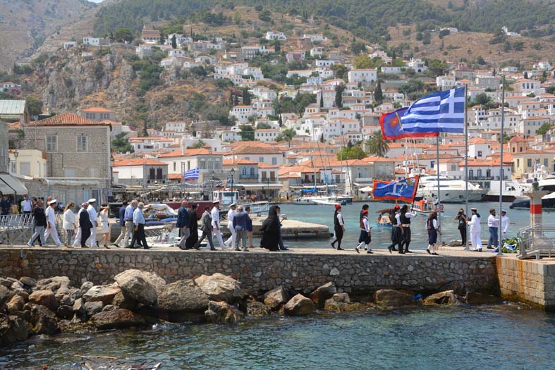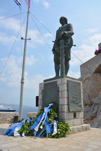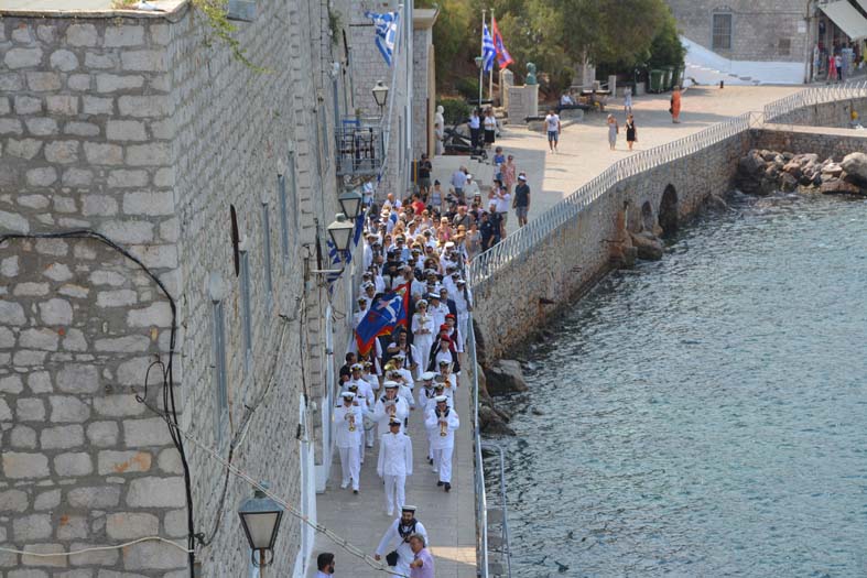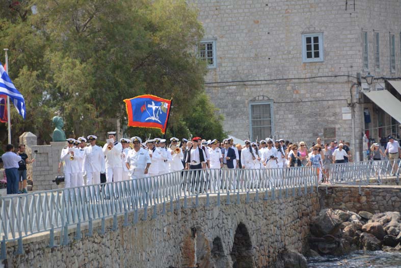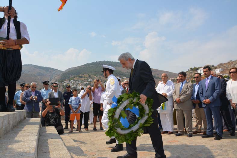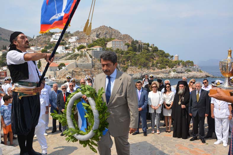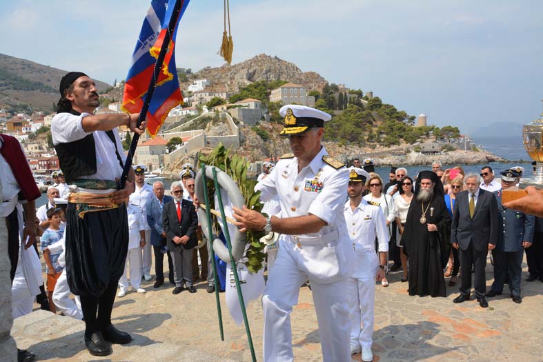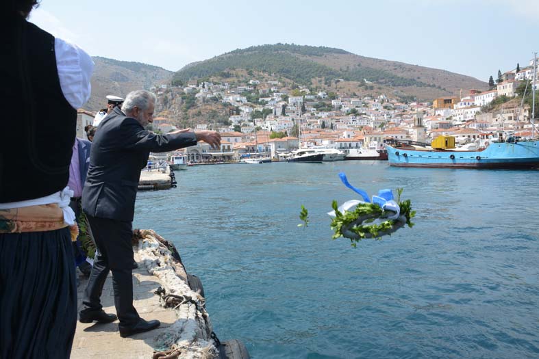 Στη συνέχεια έγινε μετάβαση των επισήμων στον προβλήτα της Ακαδημίας Εμπορικού Ναυτικού για την καθιερωμένη ρίψη στεφάνων στη θάλασσα προς τιμήν των ναυμάχων του 1821.