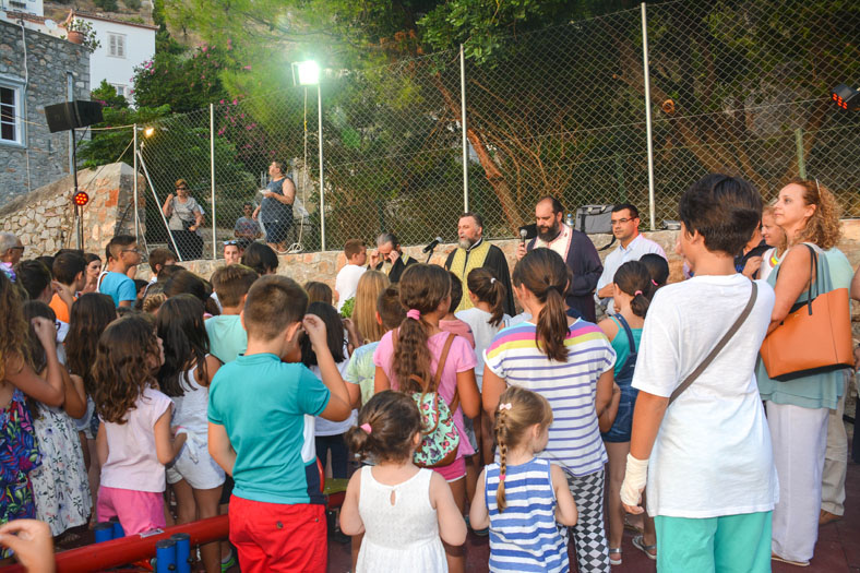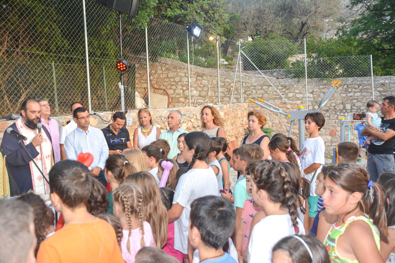 Κατά τα εγκαίνια τελέστηκε αγιασμός όπου ο Γενικός Αρχιερατικός Επίτροπος π. Ακίνδυνος Δαρδανός, συμβοηθούμενος από τον π. Γεώργιο Βλαχόπουλο και π. Ευάγγελο Γκιάκο, κάλεσε όλα τα παιδιά να έρθουν κοντά και τους ευχήθηκε να είναι πάντα ευτυχισμένα και χαρούμενα στη ζωή τους. Στη συνέχεια τον λόγο έλαβε ο Δήμαρχος Ύδρας Γιώργος Κουκουδάκης, ο οποίος δήλωσε τον ενθουσιασμό του για την πρώτη παιδική χαρά που παραδίδεται στα παιδιά του νησιού μας παρόλο που υπήρξαν αρκετές δυσκολίες. Ενώ έκανε γνωστό ότι σύντομα θα δημιουργηθούν νέες παιδικές χαρές στην περιοχή του Καμινιού και του 2ου Δημοτικού Σχολείου. Ενώ αναφέρθηκε επίσης στην αποδοχή αλλαγής χρήσης του Σαχτούριου Γυμνασίου και τη μετατροπή του σε σύντομο χρονικό διάστημα σε Βρεφονηπιακό Σταθμό.