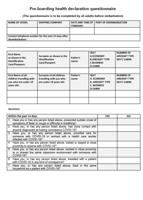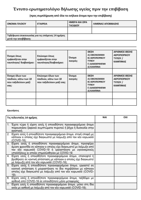Έντυπο-ερωτηματολόγιο δήλωσης υγείας πριν την επιβίβαση