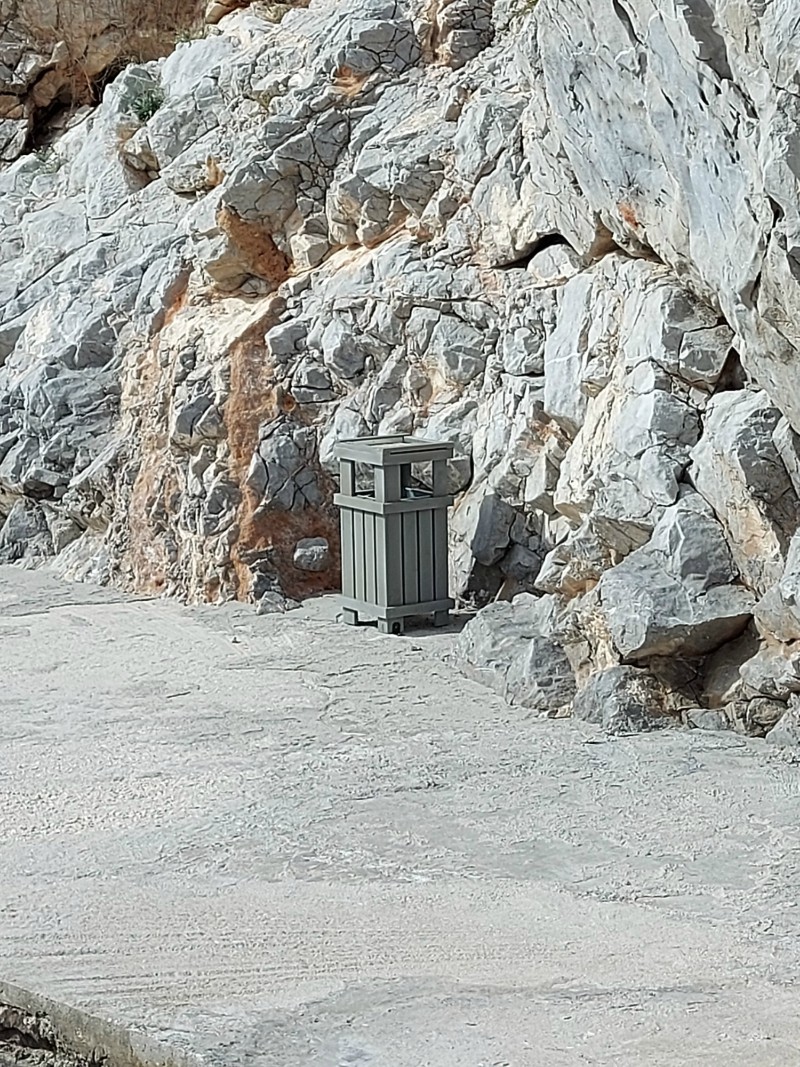 Πιο συγκεκριμένα οι μικροί κάδοι που είναι διάσπαρτοι σε διάφορα σημεία της Σπηλιάς, είναι ξύλινοι και βιδωμένοι, και διαθέτουν στην επιφάνειά τους άμμο, όπου μπορεί ο λουόμενος να σβήσει τα αποτσίγαρά του και να τα πετάξει μαζί με μικρά σκουπίδια στις οπές τους. Υπάρχει δε πρόβλεψη για καθημερινή αποκομιδή των απορριμμάτων.