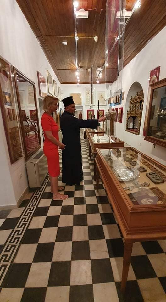 Στη συνεχεία ξεναγήθηκε από τον Γενικό Αρχιερατικό Επίτροπο της Μητρόπολης, πρωτ. Ακίνδυνο Δαρδανό στο Εκκλησιαστικό Μουσείο και έλαβε ως ευλογία τον Τόμο: " ΤΟ ΜΟΝΑΣΤΗΡΙ ΚΑΙ ΤΟ ΕΚΚΛΗΣΙΑΣΤΙΚΌ ΜΟΥΣΕΙΟ ΥΔΡΑΣ ".