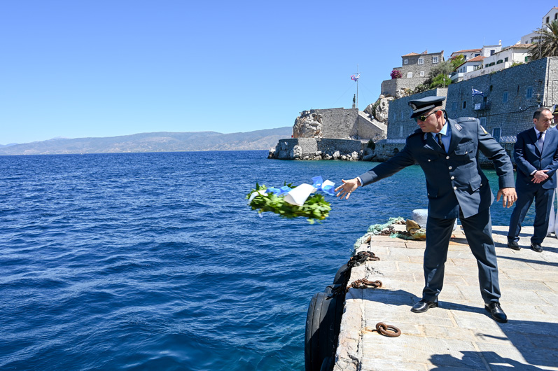 Και έπειτα η μετάβαση των επισήμων στην προβλήτα της Ακαδημίας Εμπορικού Ναυτικού για την καθιερωμένη ρίψη στεφάνων στη θάλασσα προς τιμήν των ναυμάχων του 1821.