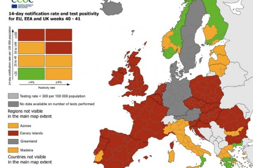 Όλες οι άλλες χώρες της δυτικής και κεντροανατολικής Ευρώπης (εξαιρούνται οι χώρες των Δυτικών Βαλκανίων) είναι κόκκινες στον χάρτη αυτό, που σημαίνει ότι καταγράφονταν 50 ή περισσότερα κρούσματα ανά 100.000 κατοίκους και το ποσοστό των θετικών τεστ ήταν 4% ή υψηλότερο κατά τις 14 τελευταίες ημέρες.