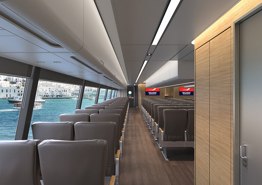 - άνετο ταξίδι ακόμα και σε συνθήκες υψηλού κυματισμού, που διασφαλίζουν οι καινοτομίες τόσο στη γάστρα του σκάφους, όσο και στα συστήματα πλοήγησης, ευρύχωρους χώρους ενδιαίτησης επιβατών με μεγάλα παράθυρα για πλήρη θέα και άπλετο φυσικό φωτισμό