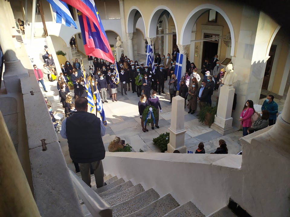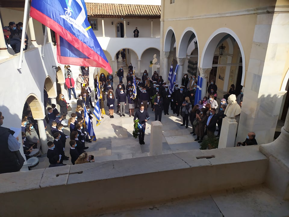 Σήμερα το πρωί πραγματοποιήθηκε στην Ύδρα στο πλαίσιο του εορτασμού της εθνικής μας επετείου της 28ης Οκτωβρίου, κατάθεση στεφάνων από τους μαθητές των σχολείων και τους σπουδαστές της Ακαδημίας Εμπορικού Ναυτικού στο Ηρώο των Πεσόντων στο προαύλιο του Ι. Καθεδρικού Ναού.