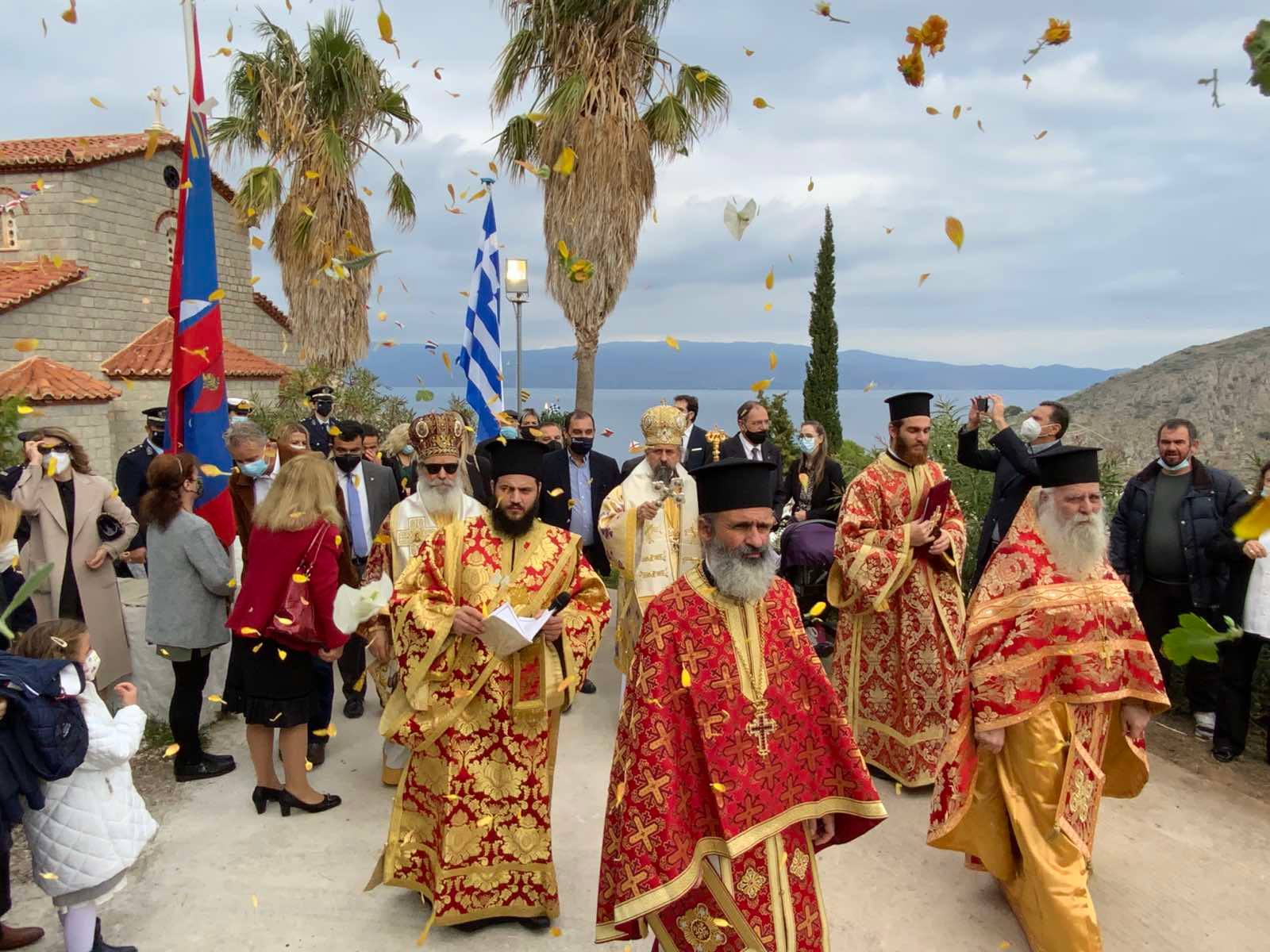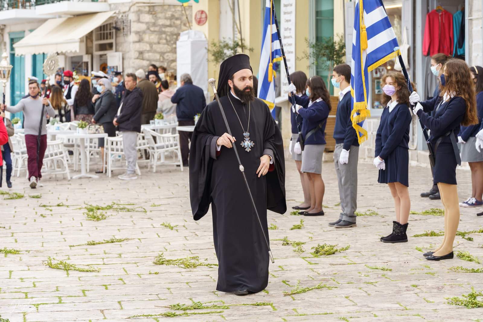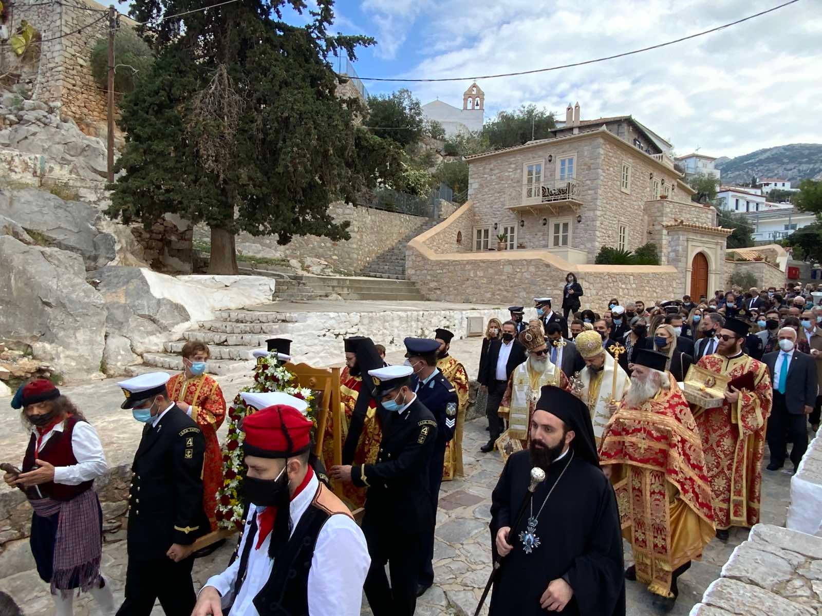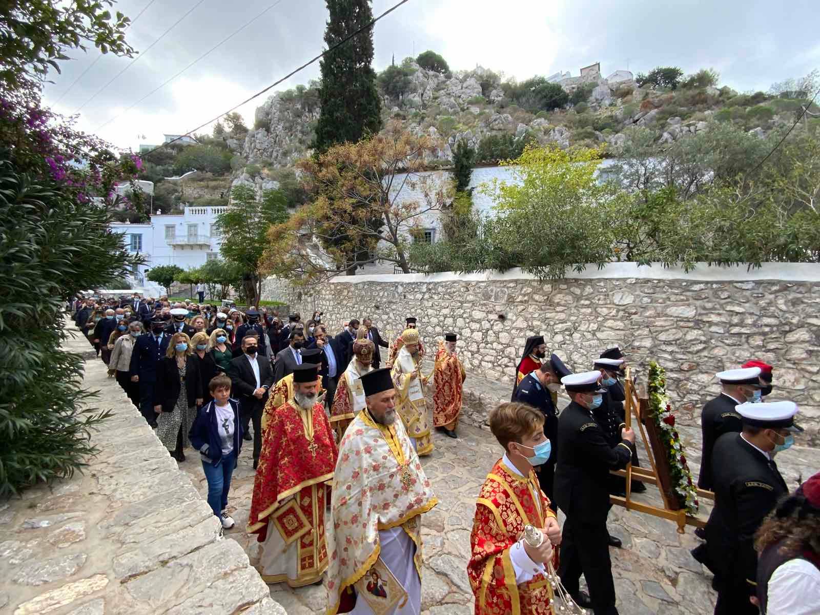 Επί της εξέδρας ο Σεβασμιώτατος Ποιμενάρχης μας κ. ΕΦΡΑΙΜ ευχαρίστησε τις αρχές κυρίως δε τα παιδιά των Σχολείων της Ύδρας εις τα οποία μίλησε πατρικά.