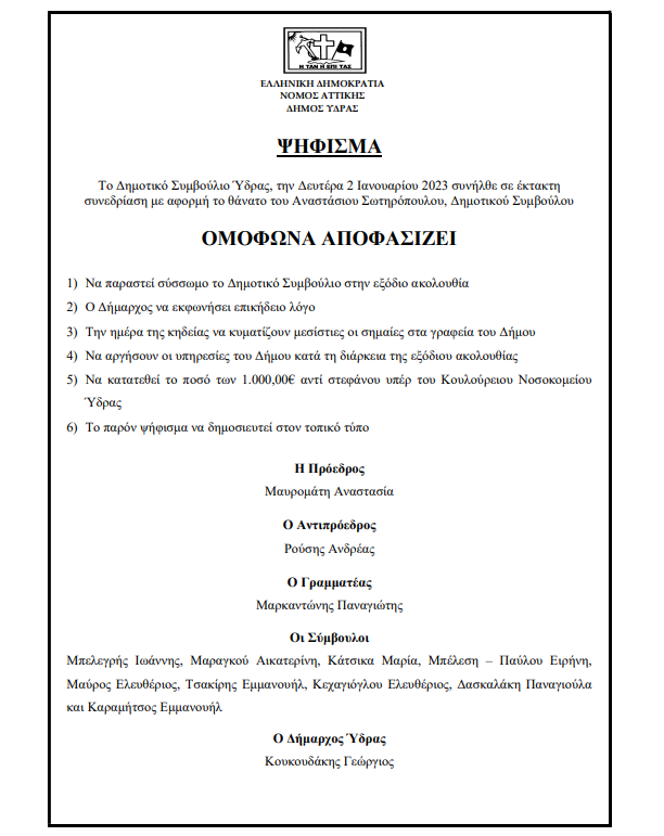 Το Δημοτικό Συμβούλιο Ύδρας, την Δευτέρα 2 Ιανουαρίου 2023 συνήλθε σε έκτακτη συνεδρίαση με αφορμή το θάνατο του Αναστάσιου Σωτηρόπουλου, Δημοτικού Συμβούλου.