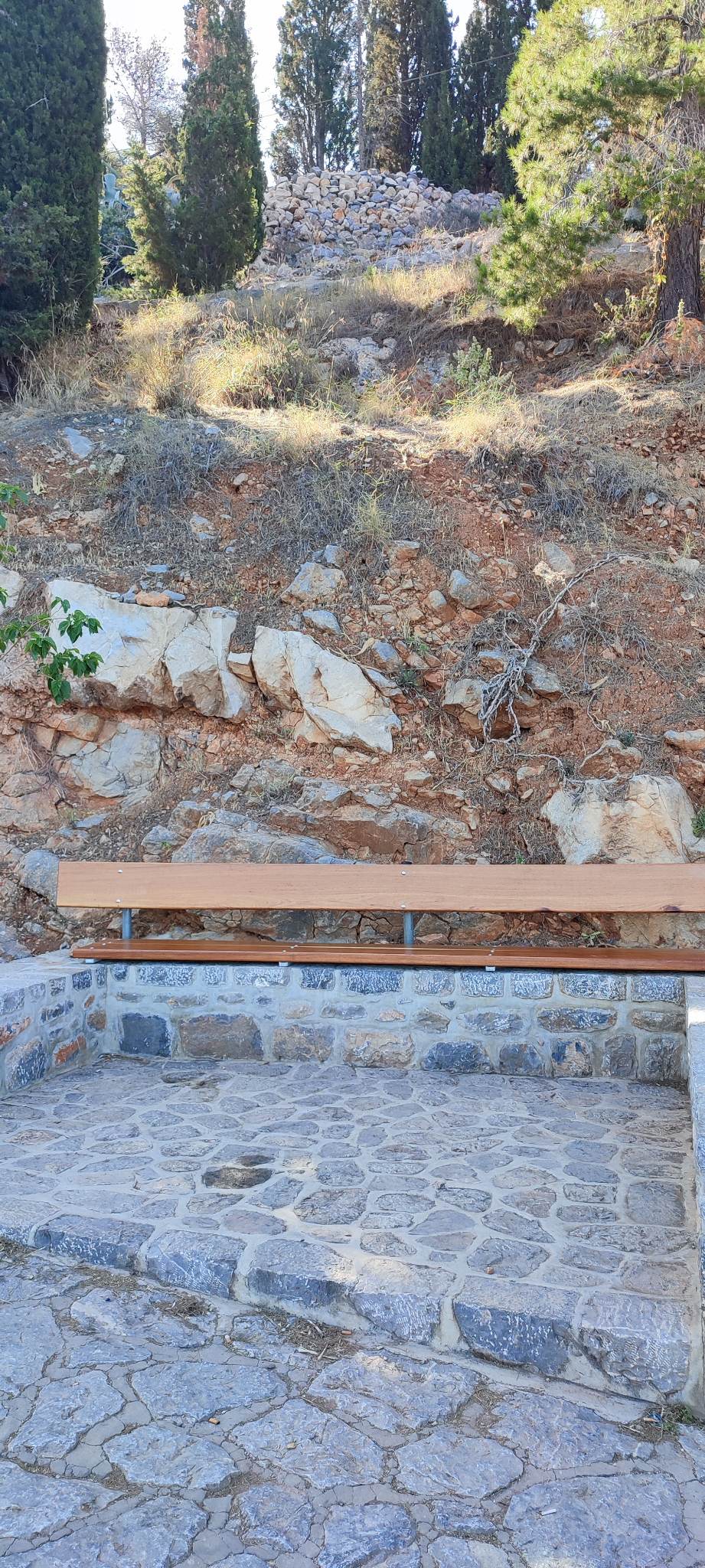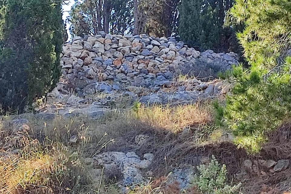Ένας σωρός από πολλές στοιβαγμένες πέτρες, οι οποίες φαίνεται να μην είναι στερεωμένες, βρίσκεται κάποια μέτρα πάνω από το παγκάκι του Λέοναρντ Κοέν στον δρόμο μεταξύ Αυλακιού και Καμινιού.
