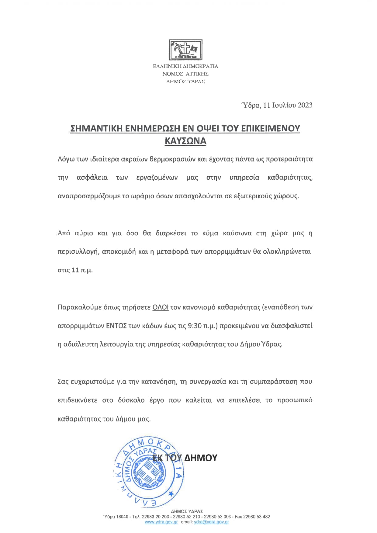 Λόγω των ιδιαίτερα ακραίων θερμοκρασιών ο Δήμος Ύδρας και έχοντας πάντα ως προτεραιότητα την ασφάλεια των εργαζομένων στην υπηρεσία καθαριότητας, αναπροσαρμόζει το ωράριο όσων απασχολούνται σε εξωτερικούς χώρους.