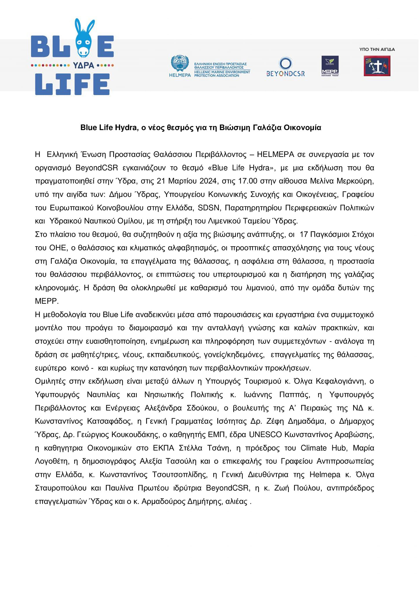 Την Πέμπτη 21 Μαρτίου στις 17:00 θα πραγματοποιηθεί στην Αίθουσα Τέχνης και Συναυλιών "Μελίνα Μερκούρη" εκδήλωση για το νέο θεσμό "Blue Life Hydra", για τη βιώσιμη γαλάζια οικονομία.