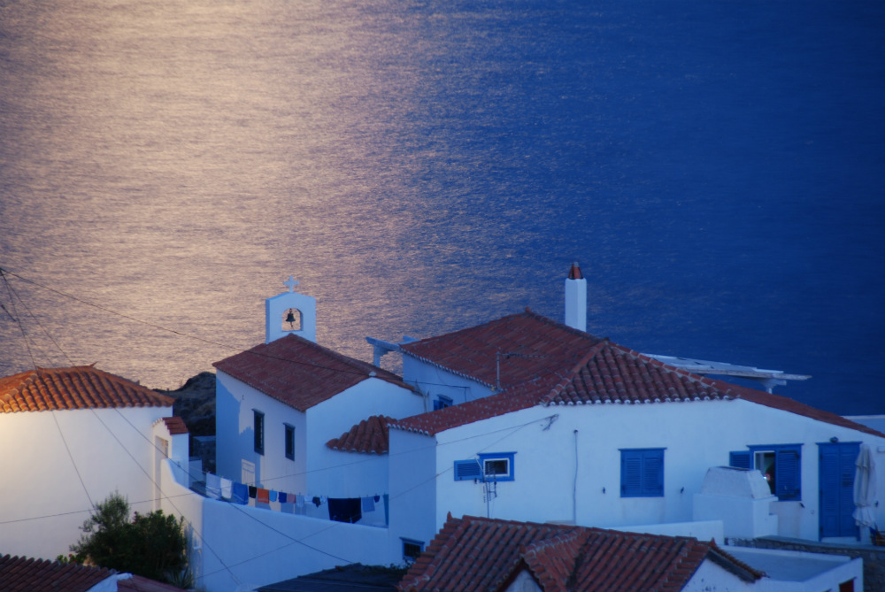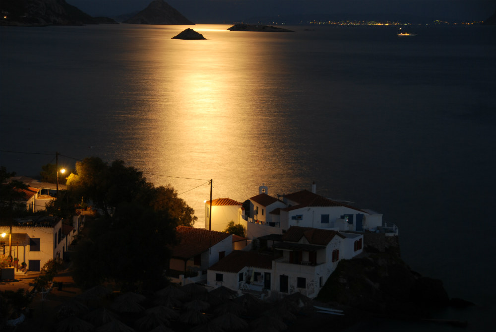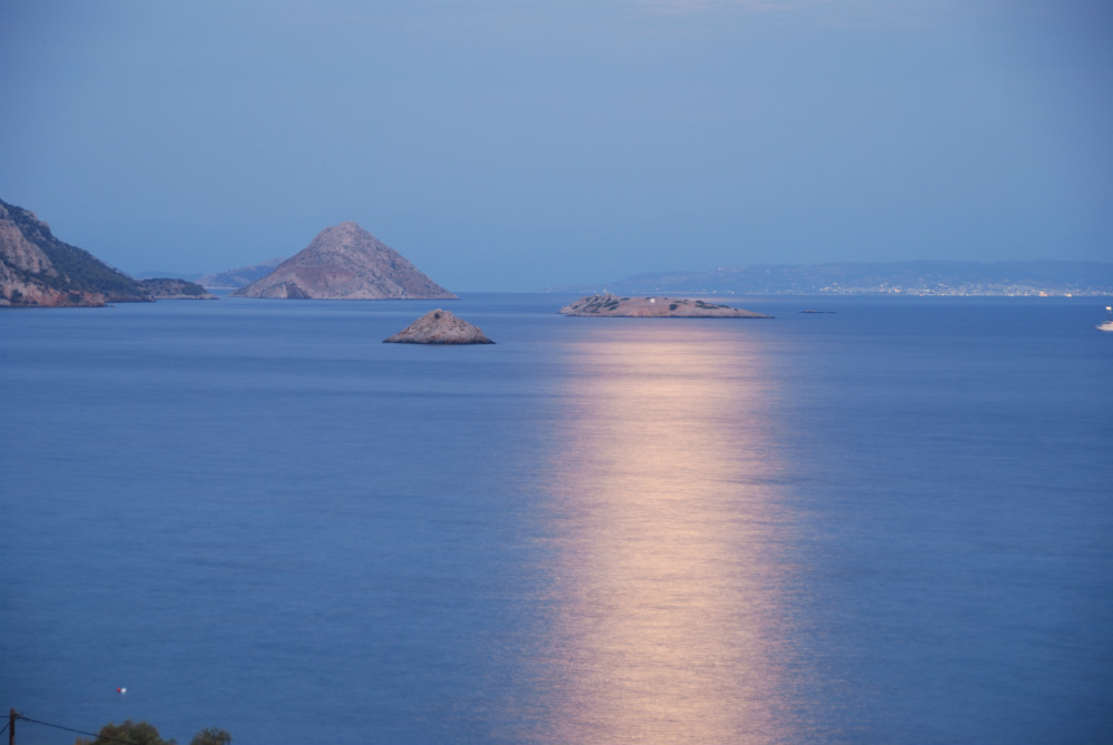 Σαν πέρασε το βράδυ που με την εικόνα του το φεγγάρι γαλήνεψε τις ψυχές μας, έπιασε σιγά-σιγά να χαράζει. Με την πανσέληνο σαν ασημένια δάδα να φωτίζει αινιγματικά το θαλασσινό μονοπάτι και να πλημμυρίζει νησιά και σπίτια με φως. Μ' αυτό το μπλε του γλυκοχαράματος του ουρανού, που μαγεμένο καλωσορίζει τη νέα μέρα, με τις ευλογίες ενός υπέροχου και νωπού ακόμα αυγουστιάτικου ολόγιομου φεγγαριού.