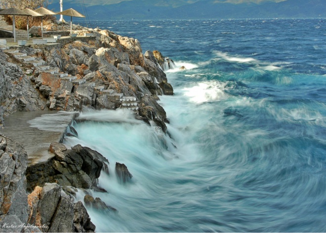 Μέσα από την ορμή τους, θαρρείς πως το κύμα δείχνει σαν μετάξι, που οι λευκές ίνες του αγκαλιάζουν την αγριάδα των βράχων. Με έναν παφλασμό το νήμα τους μπλέκεται σαν υγρή κλωστή στα βράχια και αφήνεται να κυλήσει από το υδάτινο μονοπάτι πίσω στη θάλασσα, σαν ρυάκι λυτρωμένο.
