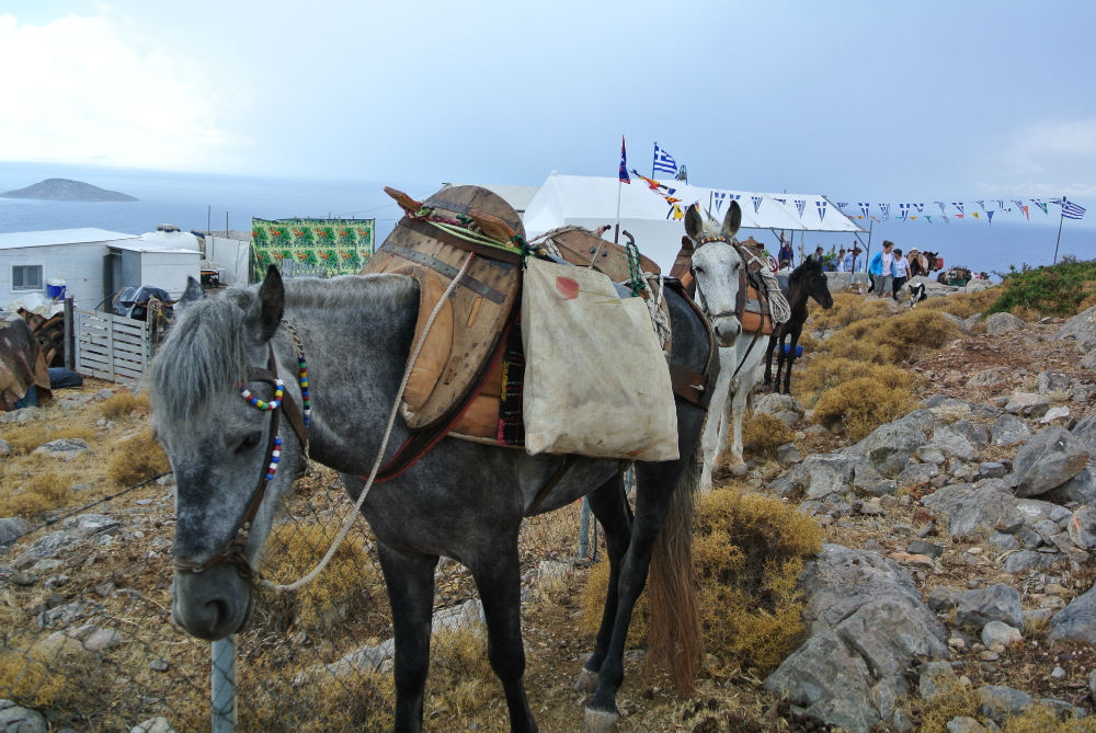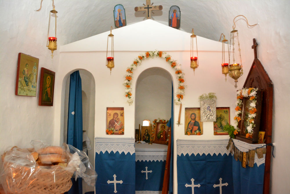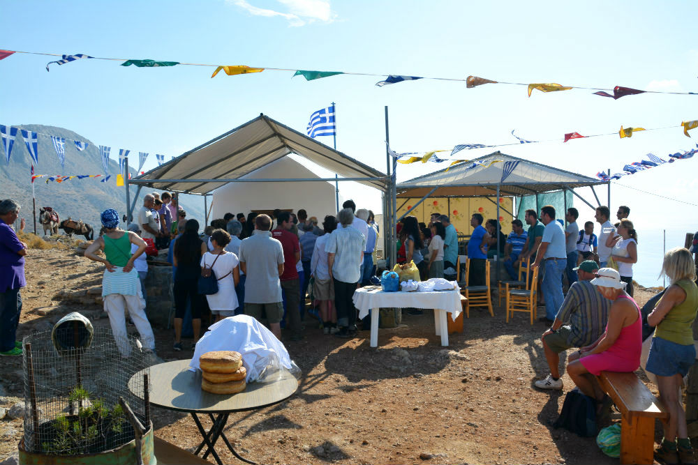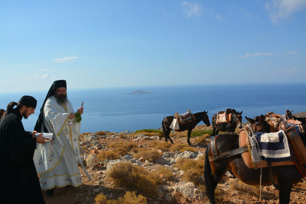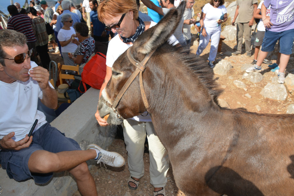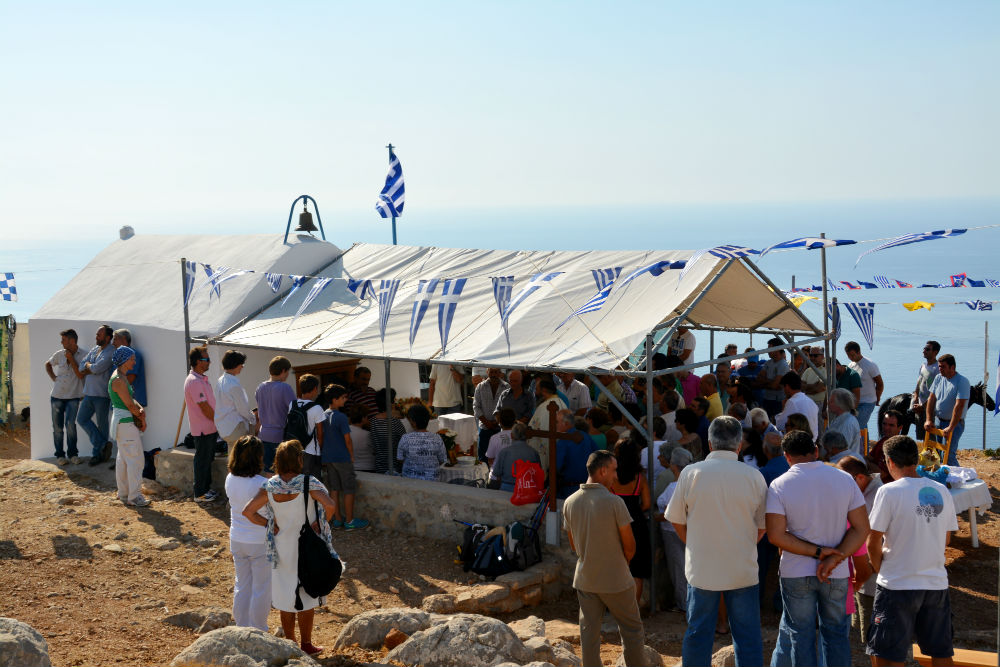 Προσεγγίζοντας το βουνό, δεν είχαμε καμιά οπτική επαφή με το μικρό ερημοκλήσι. Ακούγαμε όμως τη θεία λειτουργία, και τα βήματά μας, έφτασαν εκεί πολύ εύκολα. Η εικόνα που αντικρίζεις εκείνη τη στιγμή είναι μαγευτική. Το Σταυρονήσι απέναντι, πολύ κοντά, και η θέα πανοραμική. Το Έρως πίσω σου «αμίλητο» και αγέρωχο. Μέσα στη βουνίσια ζωή ξαφνικά βλέπεις το εκκλησάκι, φρεσκοβαμμένο, σαν μια λευκή εστία ζωής και γύρω του, κόσμο συγκεντρωμένο, που θέλησε να ανέβει στα ύψη για ένα ευλαβικό προσκύνημα. Γύρω στα 130-140 άτομα πλαισίωναν την εκκλησία, με τα μουλάρια επίσης να είναι πολλά.