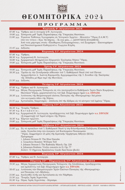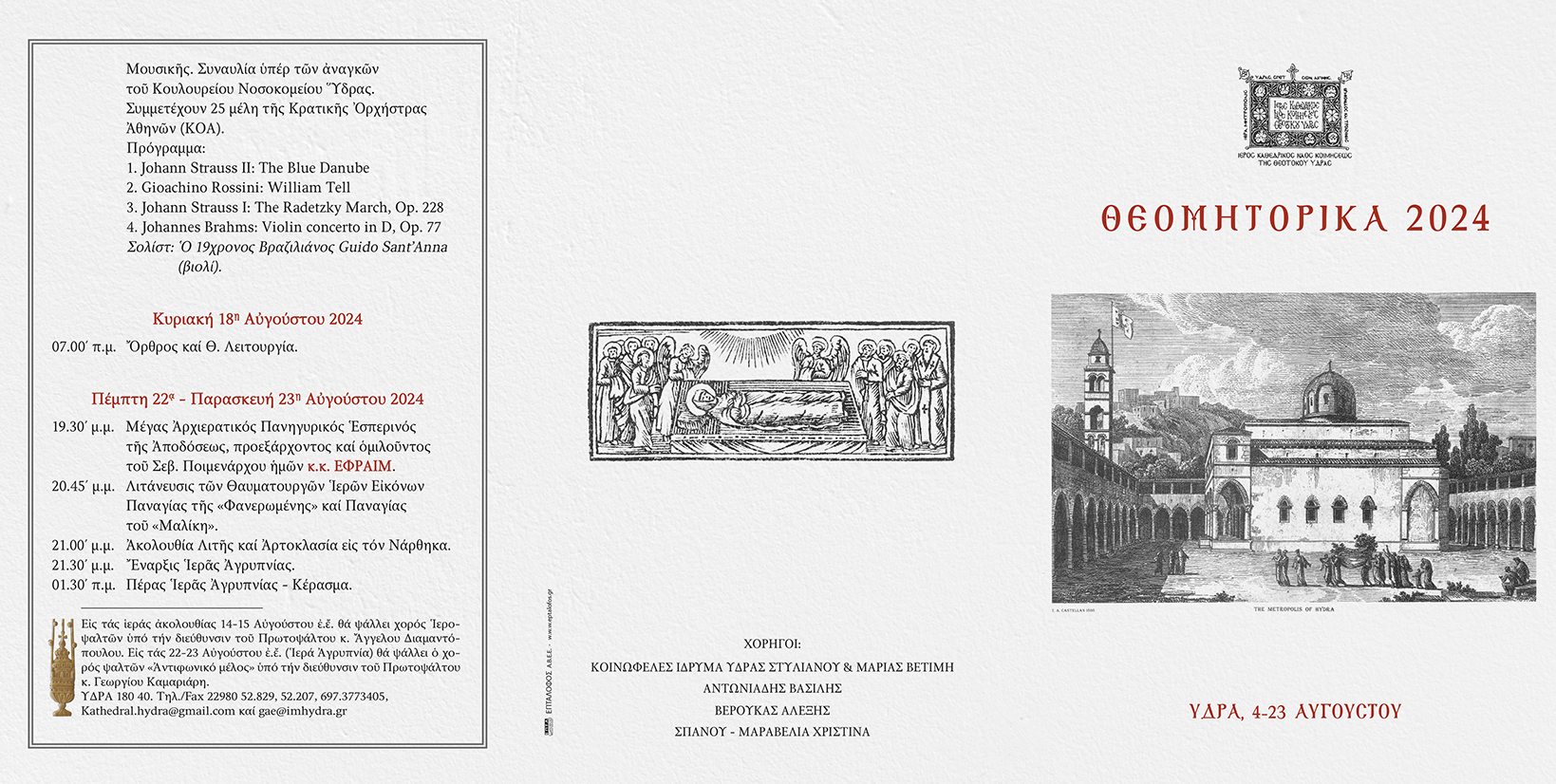19.00΄ μ.μ. Μέγας Πανηγυρικός Ἑσπερινός εἰς τόν πανηγυρίζοντα Καθεδρικόν Ἱερόν Ναόν Κοιμήσεως ΘεοτόκουὝδρας, χοροστατοῦντος τοῦ Σεβ. Ποιμενάρχου ἡμῶν κ.κ. ΕΦΡΑΙΜ.20.30΄ μ.μ. Λιτάνευσις τῆς θαυματουργοῦ εἰκόνος Παναγίας τῆς «Φανερωμένης» διά μέσου τῶν κεντρικῶν ὁδῶν τῆς Νήσου.