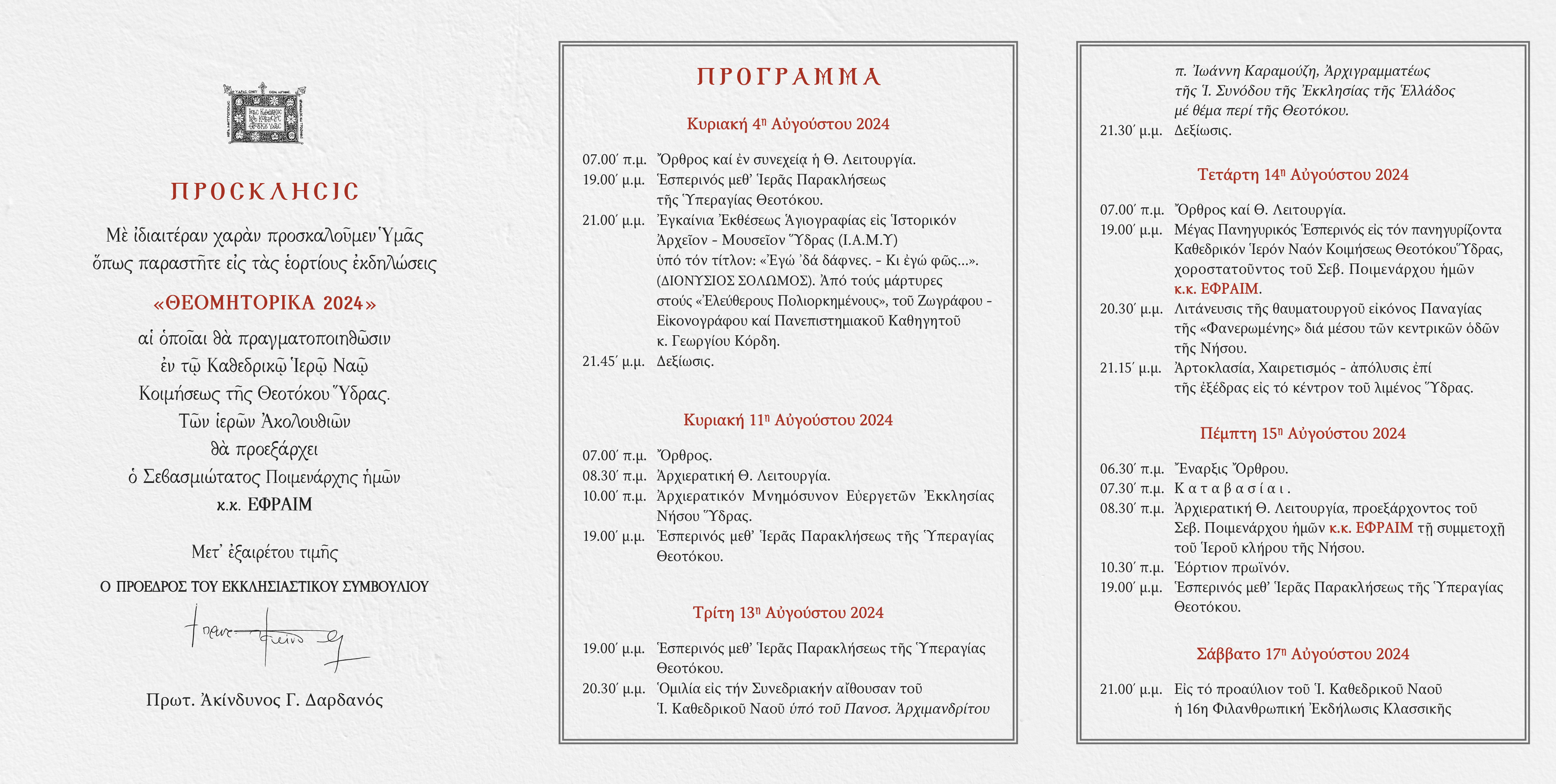 αἱ ὁποῖαι θὰ πραγµατοποιηθῶσιν ἐν τῷ Καθεδρικῷ Ἱερῷ Ναῷ Κοιµήσεως τῆς Θεοτόκου Ὕδρας. Τῶν ἱερῶν Ἀκολουθιῶν θὰ προεξάρχει ὁ Σεβασµιώτατος Ποιµενάρχης ἡµῶν κ.κ. ΕΦΡΑΙΜ