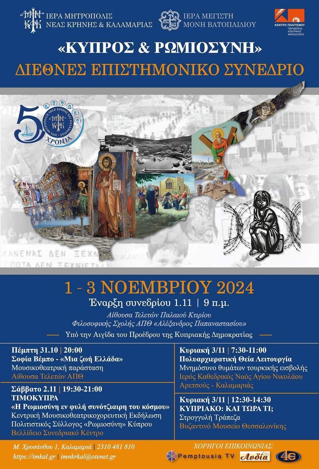 Ωσαύτως το τριήμερο 1 - 3 Νοεμβρίου ο Σεβασμιώτατος θα εκπροσωπήσει την Ιερά Σύνοδο στο Διεθνές Επιστημονικό Συνέδριο με θέμα: " ΚΥΠΡΟΣ ΚΑΙ ΡΩΜΙΟΣΥΝΗ" με αφορμή τα 50 χρόνια απο την κατοχή της Κύπρου που συνδιοργανώνει η Ιερά Μητρόπολη Ν.Κρήνης και Καλαμαριάς και η Μεγίστη Ιερά Μονή του Βατοπαιδίου.