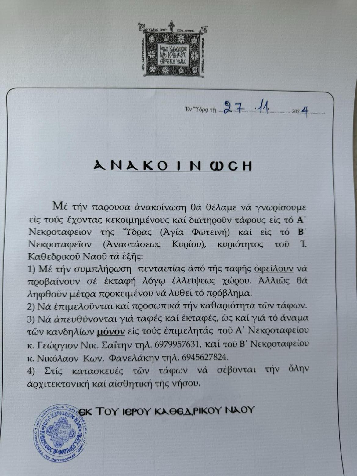 Ανακοίνωση του Ιερού Καθεδρικού Ναού Ύδρας για τα κοιμητήρια της Αγ. Φωτεινής και της Αναστάσεως