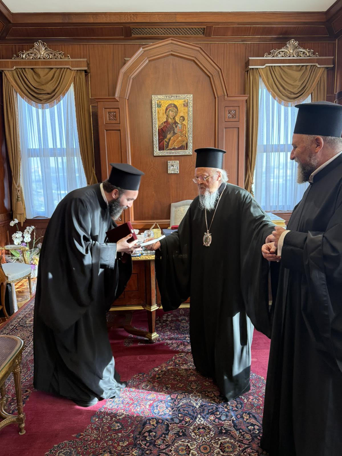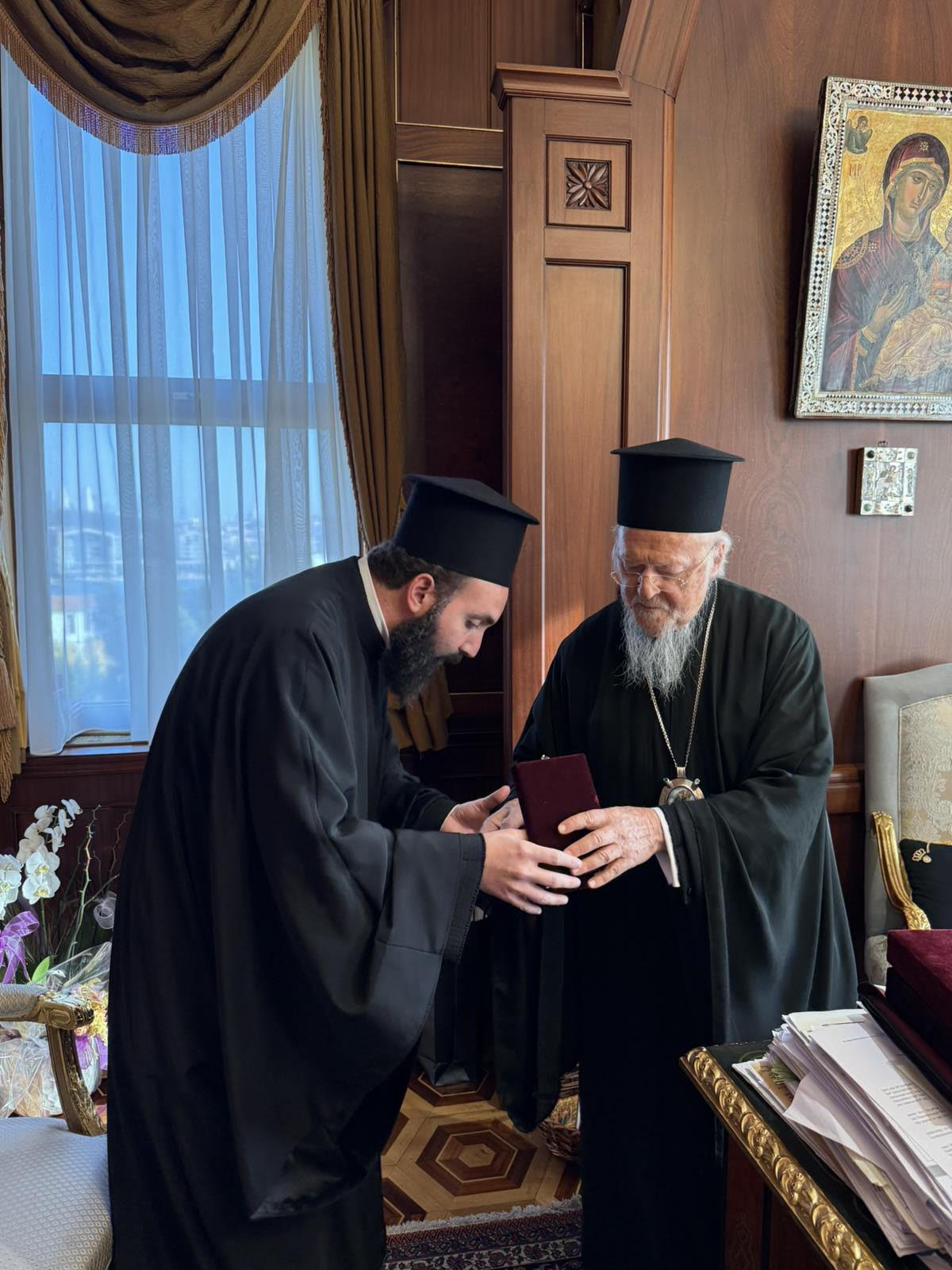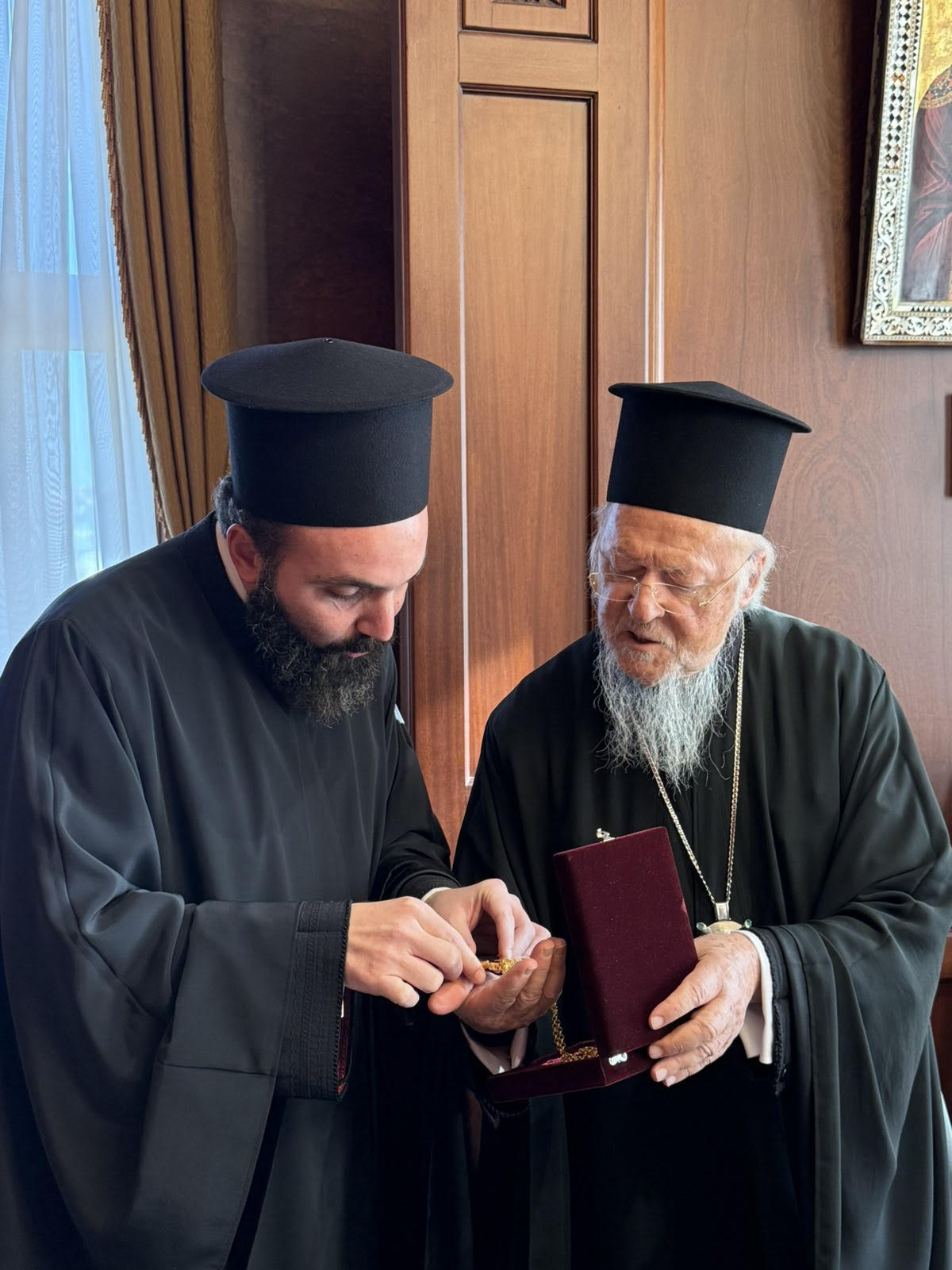 Ο Παναγιότατος Οικουμενικός Πατριάρχης κ.κ. Βαρθολομαίος επέδωσε στον Πανοσιολογιότατο π. Νεκτάριο τον επιστήθιο σταυρό της Αγίας και Μεγάλης Συνόδου της Κρήτης (2016), ένα ιδιαίτερα σημαντικό εκκλησιαστικό σύμβολο.