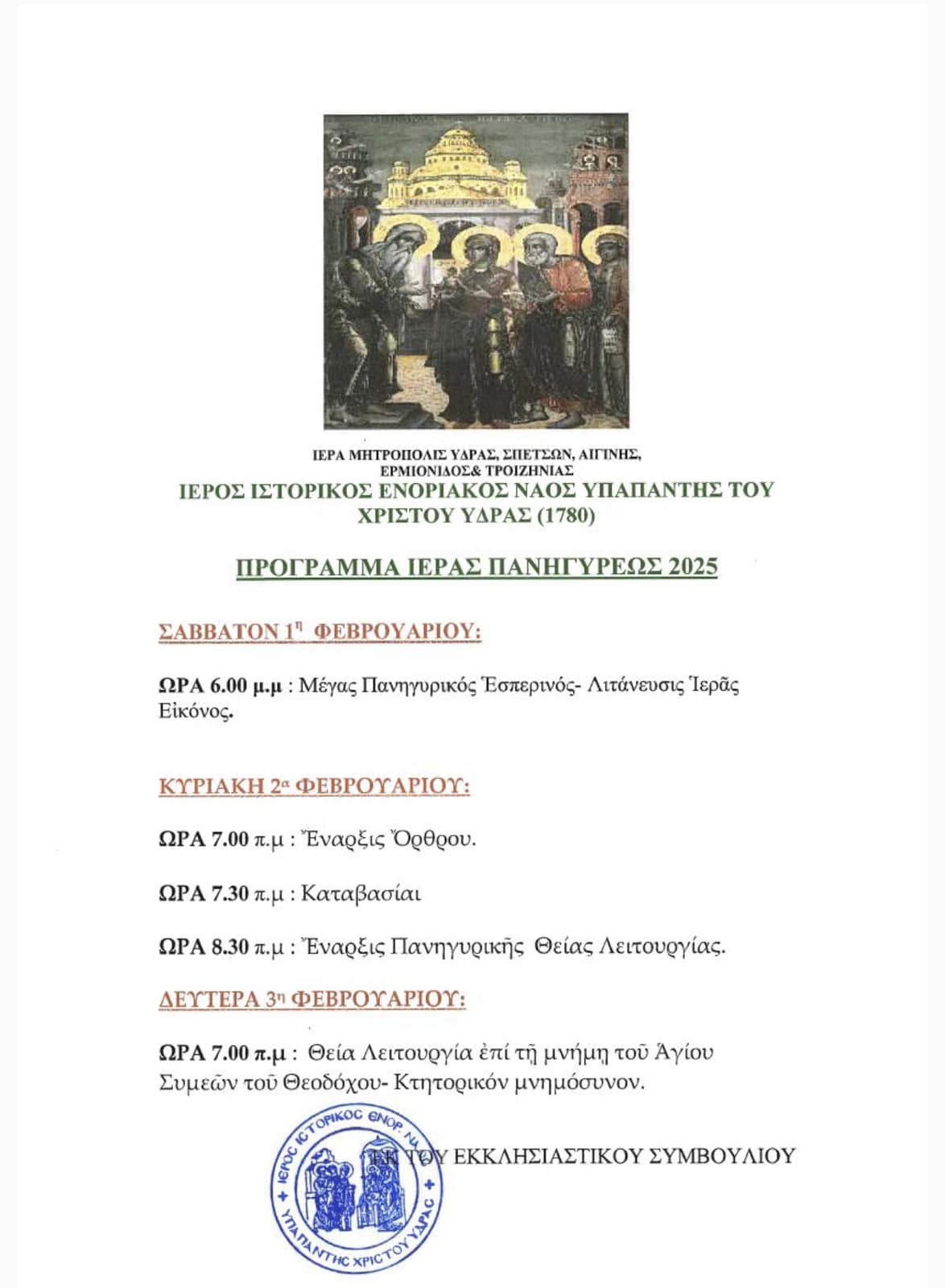 Πρόγραμμα της εορτής της Υπαπαντής του Κυρίου στην Ιστορική ενορία της Υπαπαντής στην Ύδρα