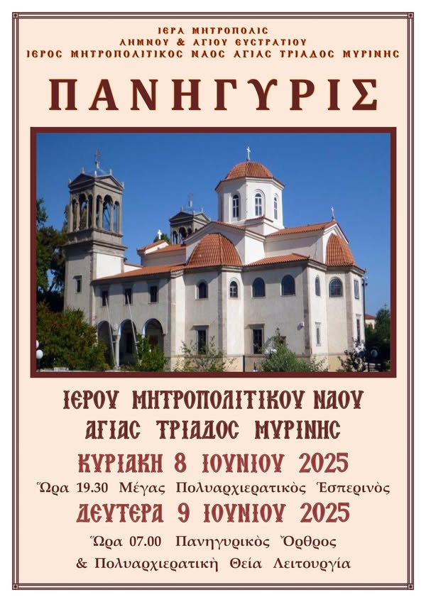 Ο Σεβασμιώτατος ποιμενάρχης μας κ. ΕΦΡΑΙΜ συνοδευόμενος υπό του πρωτοσυγκέλλου Αρχιμ. π. Νεκταρίου Δαρδανού θα συμμετέχει στον εορτασμό του Ι. Μητροπολιτικού Ναού της Αγίας Τριάδος εις Μύρινα - Λήμνου κατόπιν της ευγενικής προσκλήσεως του Σεβασμιωτάτου Μητροπολίτου Λήμνου και Αγίου Ευστρατίου κ. ΙΕΡΟΘΕΟΥ Γ’.