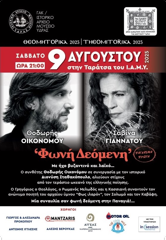 Το ΓΑΚ/Ιστορικό Αρχείο - Μουσείο Ύδρας και ο Ι. Καθεδρικός Ναός Κοιμήσεως της Θεοτόκου Ύδρας έχουν την τιμή και την ευχαρίστηση να σας καλέσουν στην Συναυλία με τον τίτλο: "Φωνή Δεόμενη" με τους Σαβίνα Γιαννάτου (φωνή) και Θοδωρή Οικονόμου (πιάνο), στην ταράτσα του ΙΑΜΥ το Σάββατο, 9 Αυγούστου 2025 και ώρα 9 μ.μ.