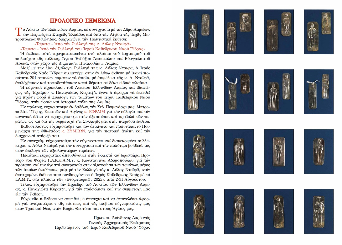 Για έναν ολόκληρο μήνα, αρχής γενομένης από την Πέμπτη 16 Οκτωβρίου, η Λαμία θα φιλοξενήσει την ξεχωριστή έκθεση "Τάματα από τη Συλλογή της Λόλας Νταϊφά" και "Τάματα – Από τη Συλλογή του Ιερού Καθεδρικού Ναού Ύδρας".