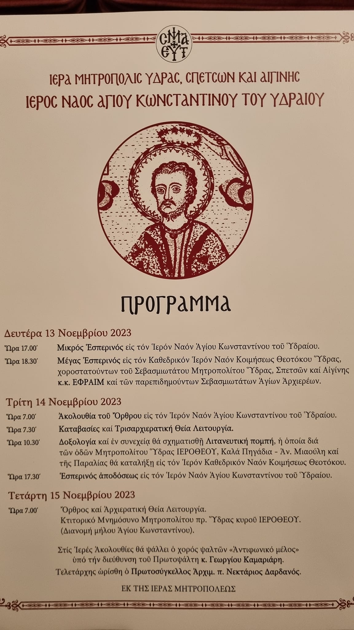Το πρόγραμμα του εορτασμού του Πολιούχου Αγίου Κωνσταντίνου στην Ύδρα