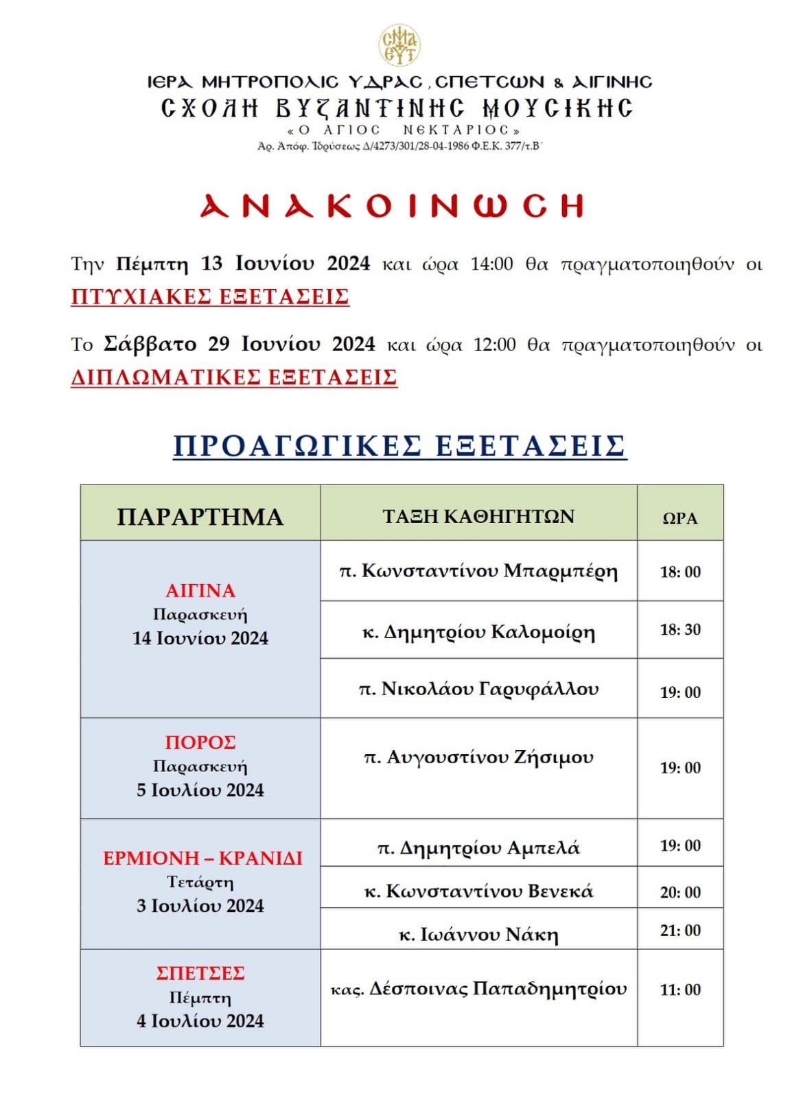 Από το Γραφείο Τύπου της Ι. Μητρόπολης Ύδρας, Σπετσών και Αιγίνης ανακοινώνεται το παρακάτω πρόγραμμα των Εξετάσεων της Σχολής Βυζαντινής Μουσικής της Ιεράς Μητροπόλεως.