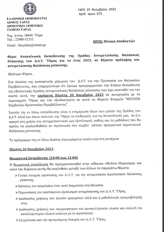 Στο πλαίσιο της ουσιαστικής μέριμνας του Δ.Λ.Τ.Ύδρας για την προστασία του θαλάσσιου περιβάλλοντος έχει προγραμματιστεί ετήσια εκπαίδευση της εθελοντικής ομάδας αντιμετώπισης της θαλάσσιας ρύπανσης που έχει συσταθεί για τον σκοπό αυτό, την Πέμπτη 30 Νοεμβρίου 2023 σε συνεργασία με το Λιμεναρχείο Ύδρας και την εξειδικευμένη εταιρεία σε αυτά τα θέματα ΜΕΤΟΠΗ Σύμβουλοι Προστασίας Περιβάλλοντος.