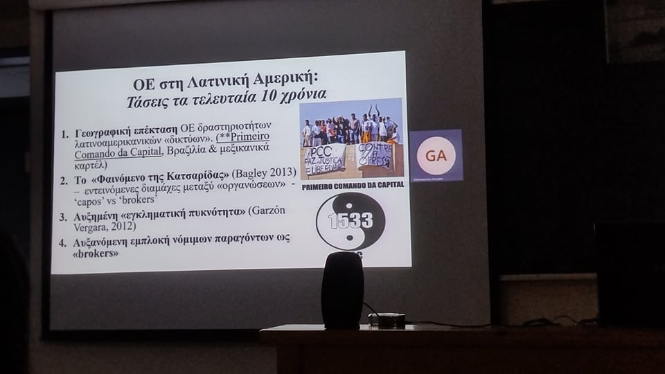 Ακολούθησε μαγνητοσκοπημένη εισήγηση ειδικά για το σεμινάριο από τον κ. Γ. Αντωνόπουλο, Καθηγητή Εγκληματολογίας στο Teesside University (UK), με θέμα «Ερευνητικά δεδομένα και τάσεις που παρουσιάζει το Οργανωμένο Έγκλημα στη Λατινική Αμερική».