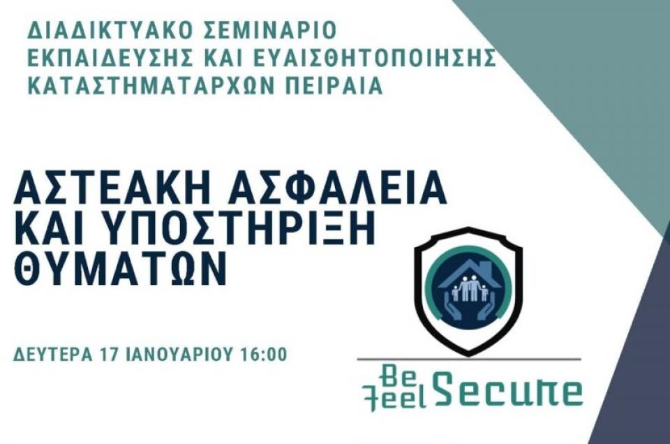 Τη Δευτέρα 17 Ιανουαρίου και ώρα 16:00 το ευρωπαϊκό πρόγραμμα BeSecure-FeelSecure (BSFS) του Δήμου Πειραιά, απευθυνόμενο σε τοπικούς καταστηματάρχες, διοργανώνει διαδικτυακό σεμινάριο με θέμα: «Αστεακή Ασφάλεια και Υποστήριξη Θυμάτων».