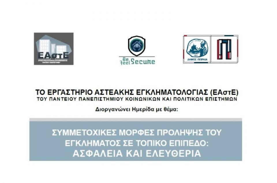 Μια σημαντική εκδήλωση διοργανώνεται από το Εργαστήριο Αστεακής Εγκληματολογίας του Παντείου Πανεπιστημίου, στο Εμπορικό και Βιομηχανικό Επιμελητήριο Πειραιώς, στις 22 Ιουνίου 2022, με θέμα "Συμμετοχικές μορφές πρόληψης του εγκλήματος σε τοπικό επίπεδο: Ασφάλεια και Ελευθερία".