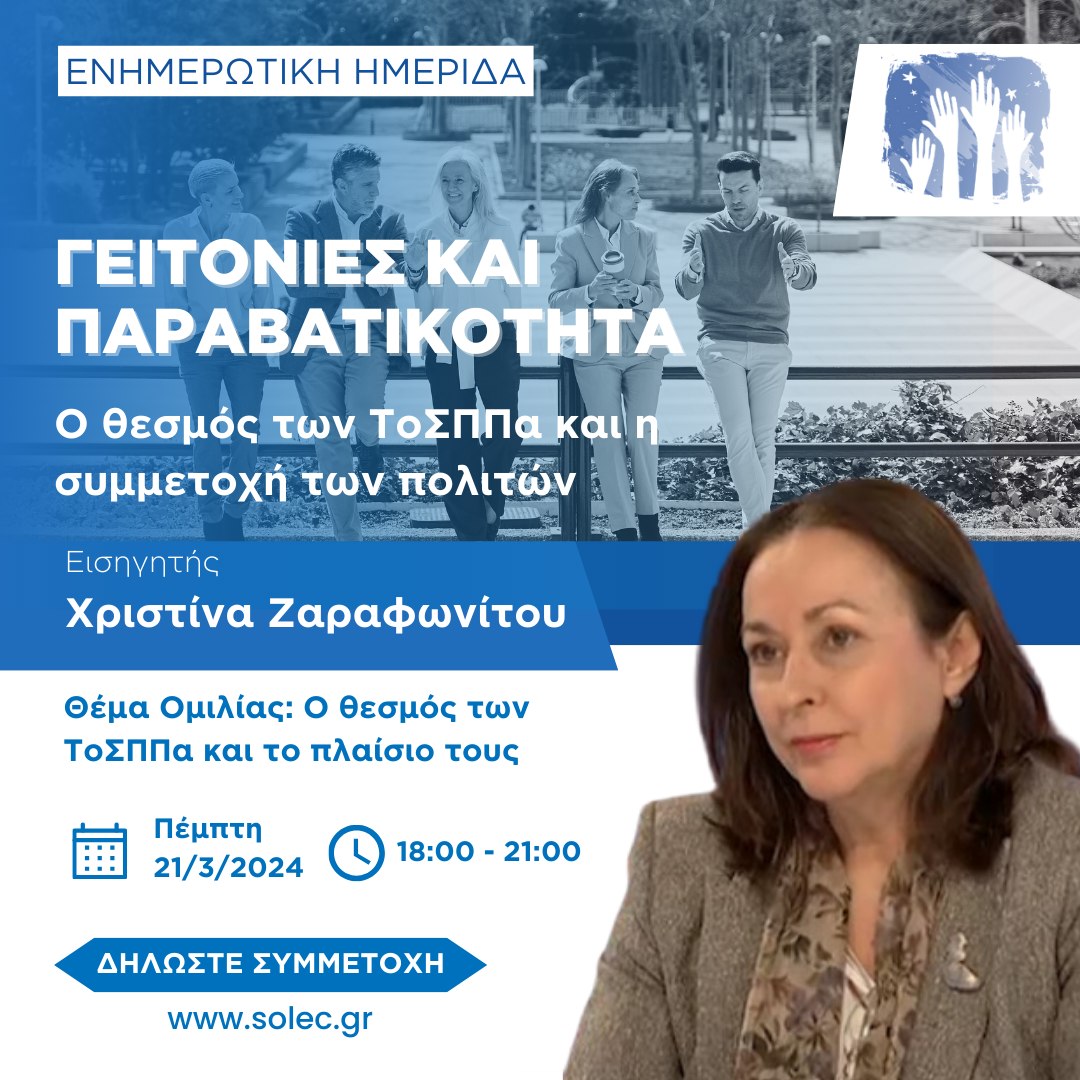 Στην ημερίδα με θέμα "Γειτονιές και Παραβατικότητα, Ο θεσμός των ΤοΣΠΠα και η συμμετοχή των πολιτών", θα φιλοξενηθεί ως κεντρική ομιλήτρια η καθηγήτρια Χριστίνα Μ. Ζαραφωνίτου.