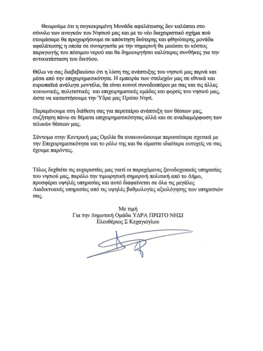 Ο Υποψήφιος Δήμαρχος Λευτέρης Κεχαγιόγλου και ο Συνδυασμός "ΥΔΡΑ ΠΡΩΤΟ ΝΗΣΊ" απέστειλαν στην Ένωση Ξενοδόχων Ύδρας την παρακάτω απαντητική επιστολή: